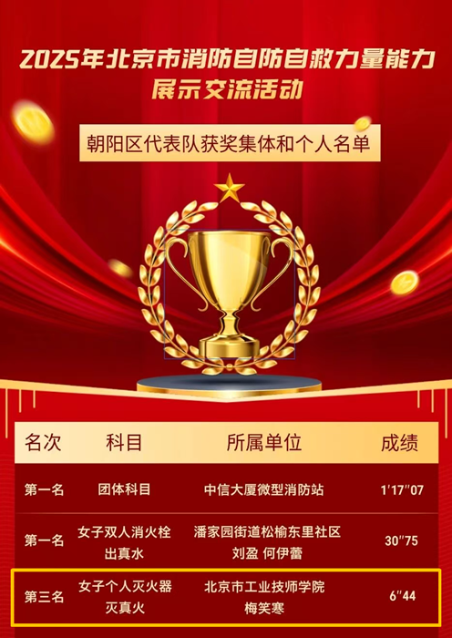 11月上旬,技師學(xué)院教師梅笑寒代表朝陽區(qū)參加北京市2025年消防自防自救力量能力展示交流活動(dòng),在“女子個(gè)人滅火器滅真火”項(xiàng)目中榮獲北京市第三名。此次交流活動(dòng),來自全市20支代表隊(duì)、600名消防安全重點(diǎn)單位、社區(qū)(村)自防自救力量隊(duì)員同場競技。