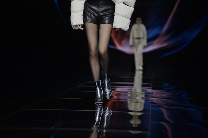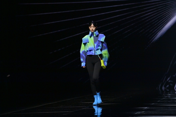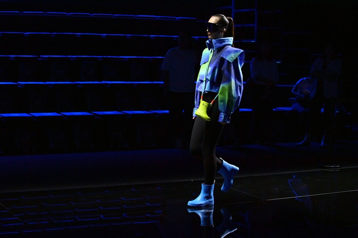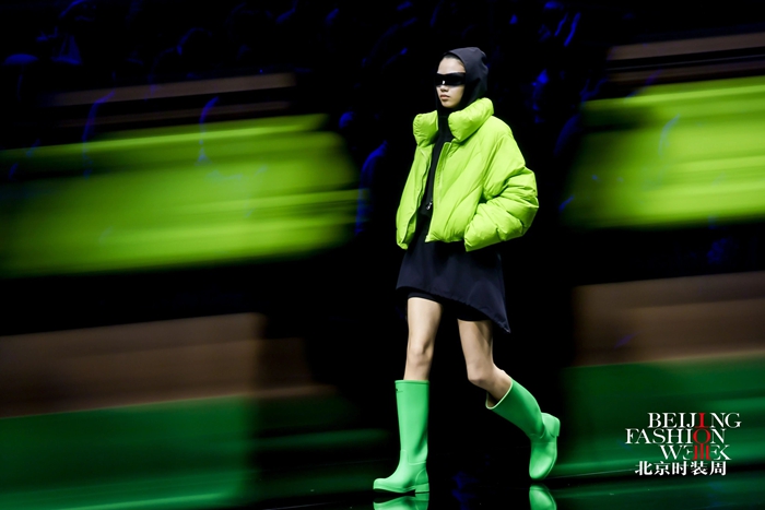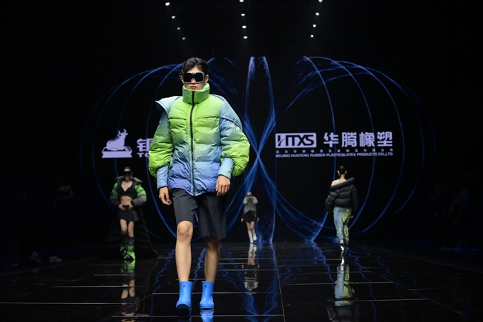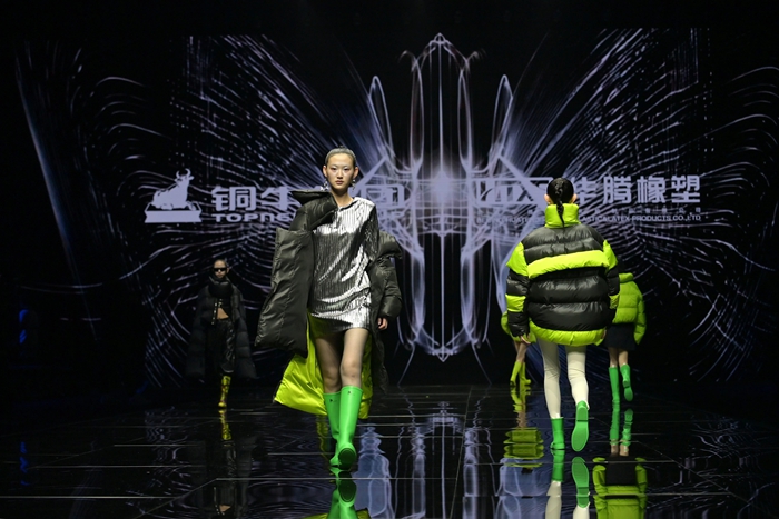 整個秀場,靚麗前衛(wèi)的膠靴或踏于足下,或成為時尚新品挎于體側(cè),伴著強勁的樂曲,綻放出化工科技在時尚前沿的另類美學(xué)。